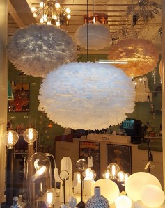 I love feather lamp shades. I find that they add so much texture and softness to a room, especially for a room with cold material and little fabric/ no carpet. For a pendant version, the bigger the better.