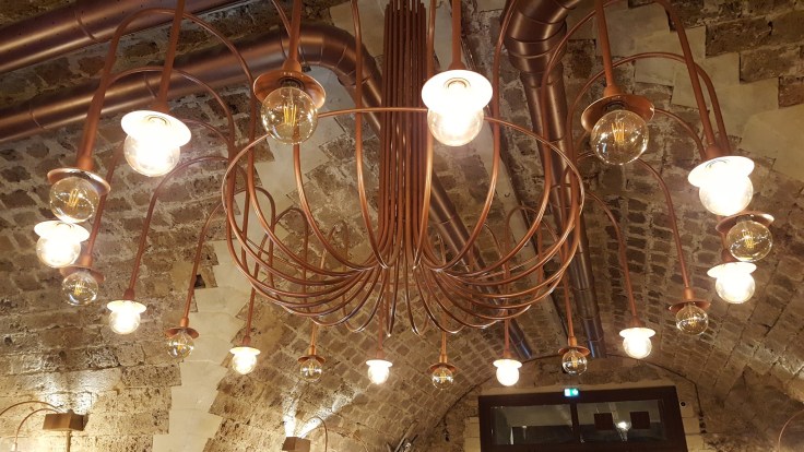 Definitely a statement ceiling lighting installation, industrial style, actually used by the restaurant as their logo.